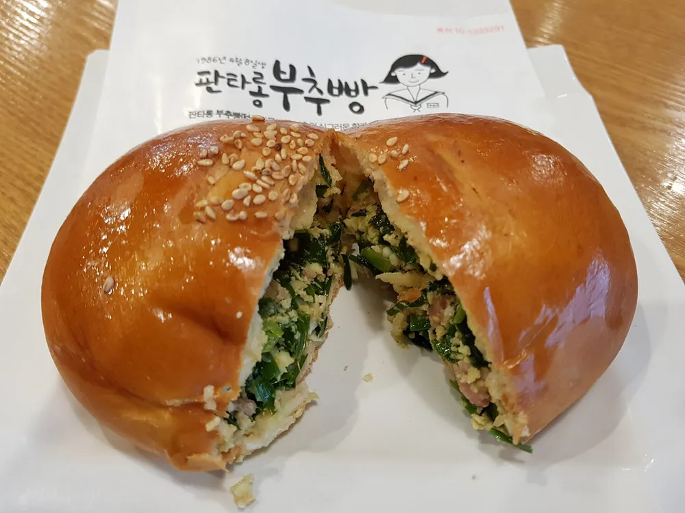 그리고 부추빵도 꼭 사가세요! 고소한 부추와 당면이 들어간 빵인데, 단짠단짠의 맛이 일품이에요. 저는 개인적으로 이게 튀김소보로보다 더 맛있더라고요 😋