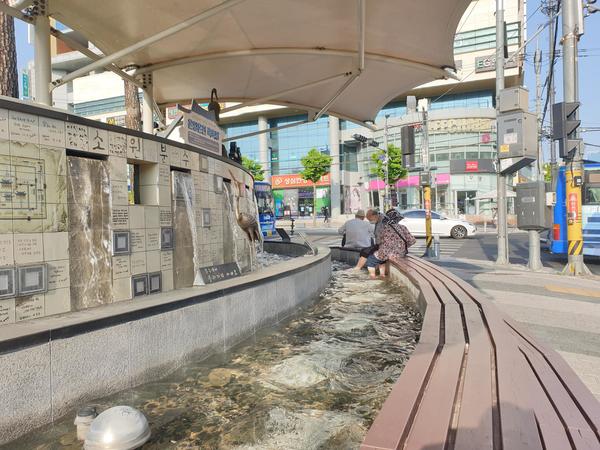 온양온천역 교각 아래와 온양전통시장 입구에 족욕탕이 있어요 👣 전통시장 입구쪽 족욕탕의 수온은 별도의 가열을 하지 않는데도 45도 내외로 꽤나 뜨거운 편이랍니다.